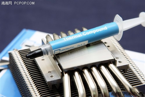 散热器附带了PK-1高性能硅脂,硅脂比较粘稠涂抹的时候挺费力但是性能不错。因为是为HTPC平台设计的散热器所以对散热片身材的控制很用心,在不影响性能的情况下尽可能压缩体积并裁剪多余的边角部分,尽量不影响到其它配件。