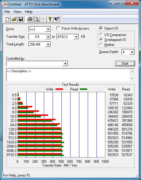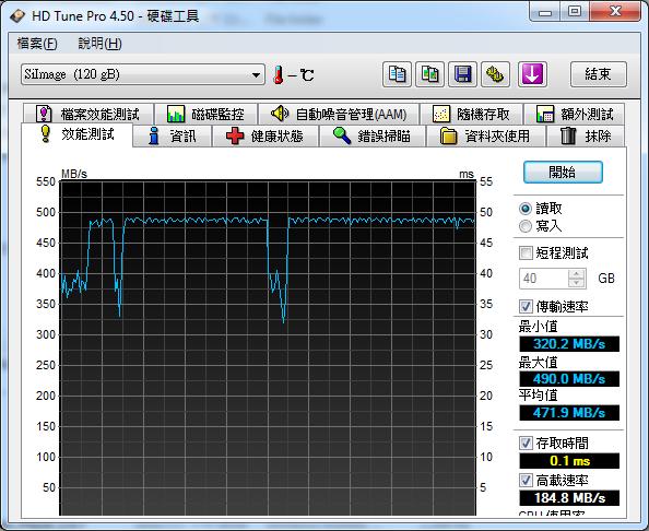 REVO 120GB的ATTO效能測試表現很不錯,有接近官方宣稱的540MB/s,但是官方測試一定是在完全乾淨的資料碟情況,這是已經有資料的狀態,所以效能會稍微低一些。