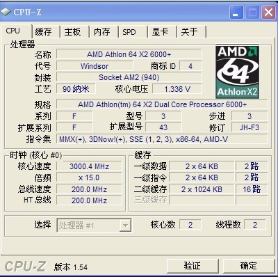 AMD速龙6000处理器拥有主频为3000MHz,外频为200MHz,倍频为15倍,总线频率达1000MHz,此外还拥有128KB的一级缓存和2MB的二级缓存。
