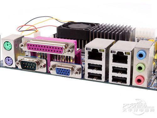 图片评测论坛报价 接口方面并没有因为主板的尺寸而缩减,提供了6个USB2.0接口,I/O接口方面提供了1个PS2鼠标接口,1个LPT以及1个VGA、1个RJ45网卡接口,3个JACK音源输入。同时板载千兆双网卡以及集成6声道音效芯片。