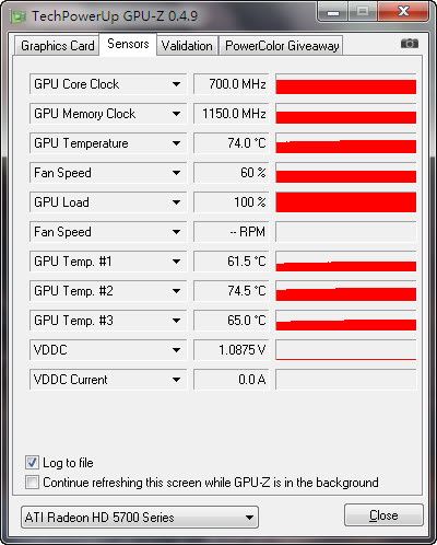 60%的风扇速度勉强压住furmark,74度。不过现在是冬天,如果是夏天的话,温度会更恐怖的。100%风扇速度下能更好的压制温度,不过噪音实在巨大,不推荐用户将风扇调至全速使用。