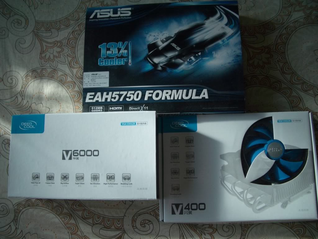 好了,言归正传,下面介绍下两款散热器的外观:因为5850的卡暂时没到,先测下v400。评测用的显卡是著名的华硕hd5750 F1赛车版。上个图大家看下。