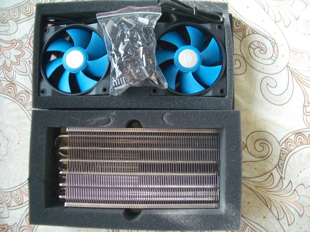 v6000的内部如下图所示,包含散热器本体,两个9cm风扇,硅脂,扣具包及显存散热片,v6000的扣具比v400要复杂,需要先固定支架再按螺丝,显存散热片也多些。不过硅脂是一样的。