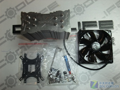 LGA775、LGA1156、LGA1366、AMD所有接口平台)、Intel与AMD扣架各1套、1个绝缘胶垫、4颗塑胶帽、4套固定螺丝、4根风扇固定铁丝、一支2g装的导热硅脂、一款12cm半透明PWM风扇以及一本用户手册。