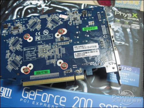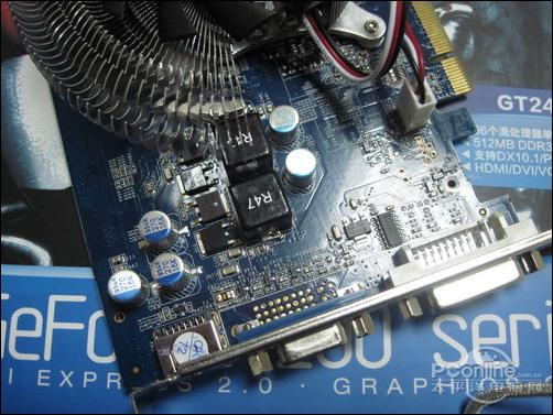 供电方面,显卡采用了多颗日系高品质固态电容和密闭电感组成的供电电路。结合GT240不高的核心功率和电压来看,这样的设计还是比较扎实的。