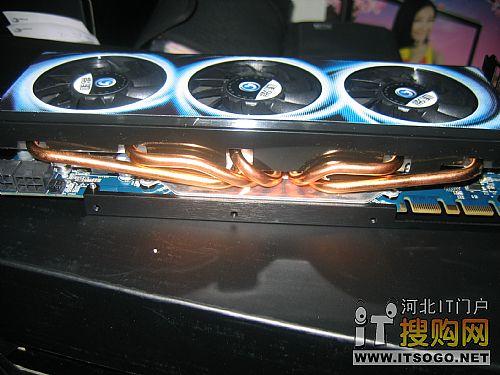 影驰非公版GTX260在散热器方面采用了自行研发的三风扇设计,并采用了5热管穿Fin设计,全覆盖式的风罩设计可为PCB实现整体散热,具有不错的散热效能