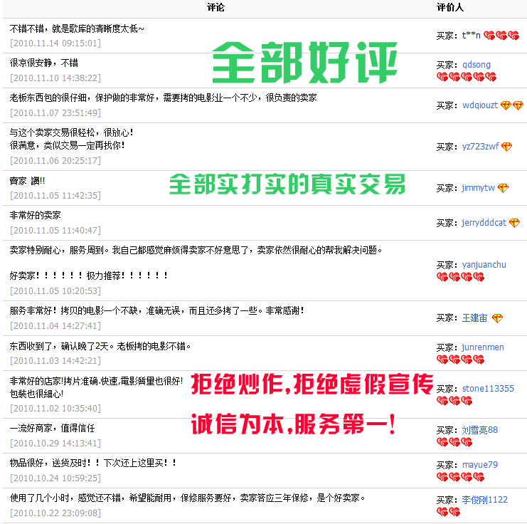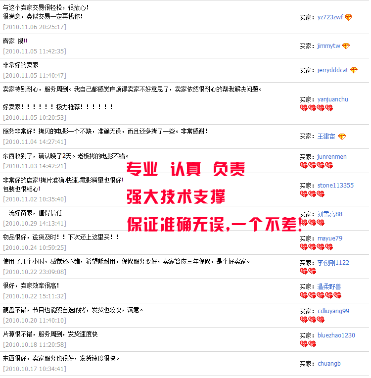 [qq]839728069[/qq] 本店已经成为PCI论坛认证商家,专版(http://we.pcinlife.com/forum-forumdisplay-fid-406-page-1.html)欢迎大家去那发贴!大家找本人购物更加放心! 正品行货WD 2T EARS 绿盘,可以官网查号验证,我只撕开小口子拷的!只要578元!淘宝每月都能卖出去上百个!好评如潮!感兴趣的朋友可以下载我的高清目录看看!有原盘和720p mkv高清可自选拷贝。 高清目录下载地址(2011.7.19更新):http://kanpianla.3721up.com/ 相关高清硬盘链接: WD20EARS(西部数据 2T绿盘64M缓存 3碟封装)拷满高清包邮只要578元! 淘宝链接:http://item.taobao.com/item.htm?id=9793852763淘宝链接:http://item.taobao.com/item.htm?id=4314000135 WD10EADX(西部数据 1T新绿盘32M缓存双碟封装sata3接口)拷满高清包邮只要385元! WD10EALX(西部数据1T新蓝盘32M缓存双碟封装7200转sata3接口)拷满高清包邮只要485元! 淘宝链接:http://item.taobao.com/item.htm?id=8441738721 移动硬盘类链接: 西部数据 元素系列3.5寸2T移动硬盘(USB2.0接口)拷满高清包邮只要798元! 淘宝链接:http://item.taobao.com/item.htm?id=8396708261 日立 阿童木系列X500 500G 2.5寸移动硬盘(USB2.0接口)拷满高清只要388元! 淘宝链接:http://item.taobao.com/item.htm?id=8838065971 此外还有亿格瑞 HDX等品牌高清播放机,可以随盘一起购买,欢迎大家选购! 价格随时更新,以上价格仅供参考,准确信息以淘宝店内价格为准。 WD 2T 包装照片: ![]() 本商品部分好评截图: ![]() ![]() |