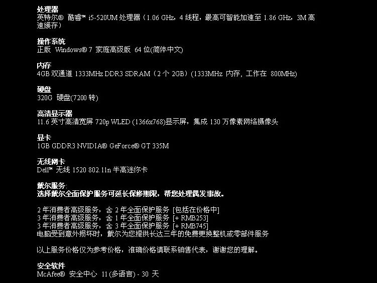 配置1-- 7200元 | M11X R2 I7-640/2G DDR3/320G 7200pro/1G GT335M/11.6 LED屏幕/无线/内置镜头/蓝牙 |