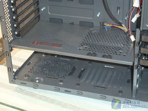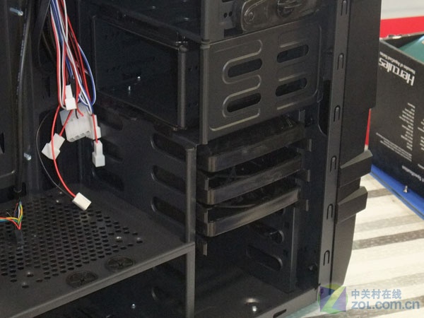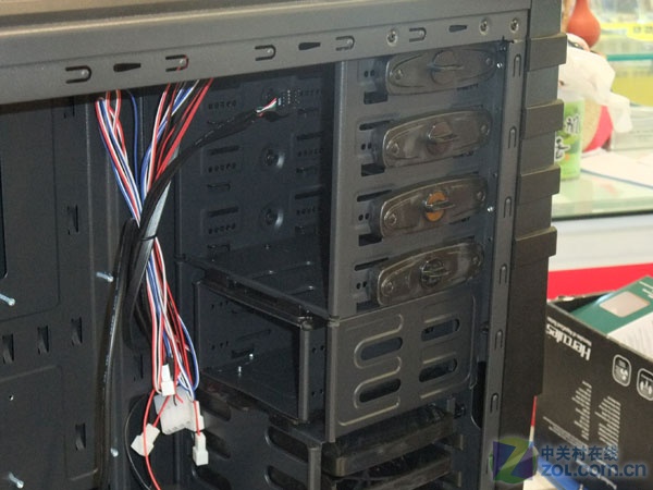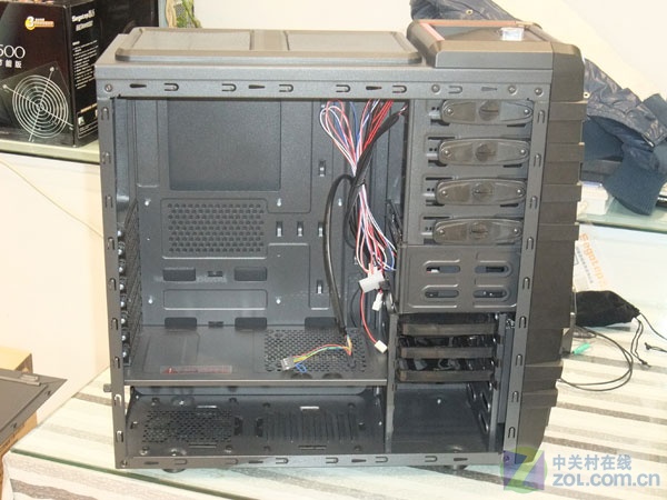 机箱驱动器为配有4个5.25英寸光驱位,7个3.5英寸硬盘位,其中5个为侧向免工具设计,另外两个为则为硬盘笼设计,并且兼容2.5英寸SSD硬盘。