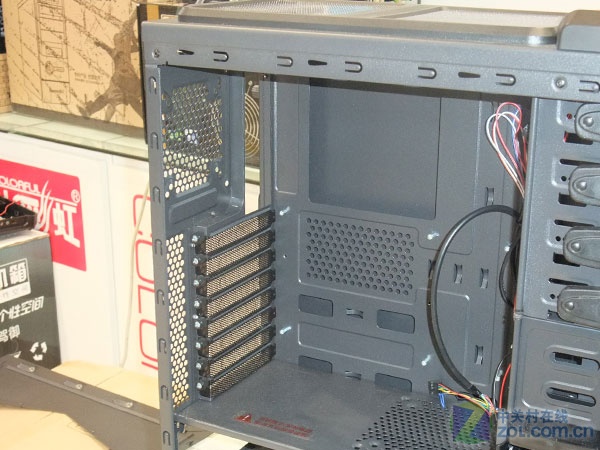 机箱机箱设计有8个PCI扩展槽,并且支持10孔的背板走线设计,另外在机箱电源位设计有一个挡板将电源与板卡区域分隔,形成独立风道设计。同时,为了满足进风量,机箱底部以及挡板处设有风扇孔位。