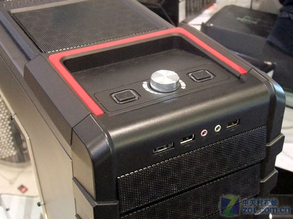 雷诺塔G2机箱顶部的I/O区的配置与雷诺塔一致,带有两个USB2.0接口、一组音频接口、一个e-SATA接口、一个风扇调速旋钮以及电源开关按键和重启按键,并且带有一个储物槽。
