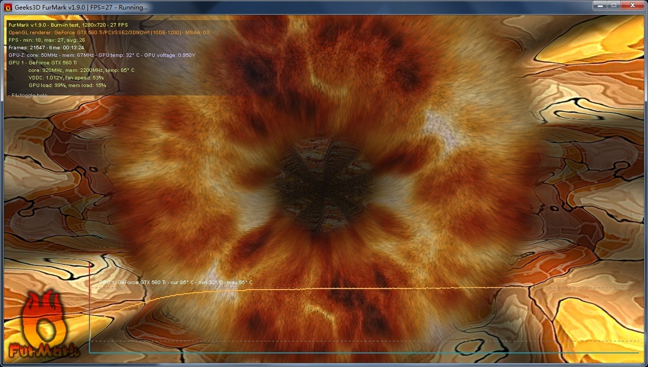 htwang 发表于 2011-3-15 22:58 920Mhz默认的560Ti,FURMARK 烤到85度,说实话,我觉得还不错 ,哈哈 ,对于一张满载接近300W的卡~~ 我看 ...