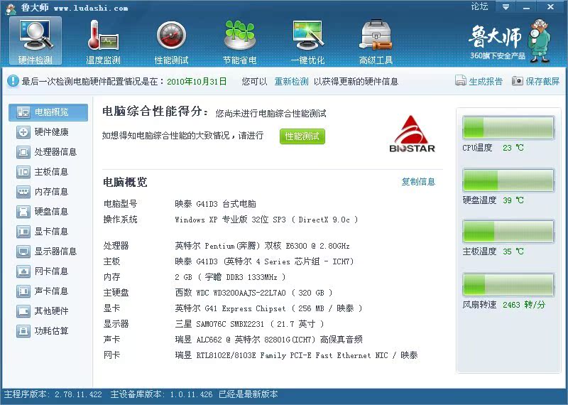 奔腾E6300(新的奔腾,主频2.8G的)+宇瞻2G DDR3 1333+映泰G41D3(支持DDR3小板)+320G 蓝盘(满扫全绿)+航嘉电源(额定功率250W)+普通机箱