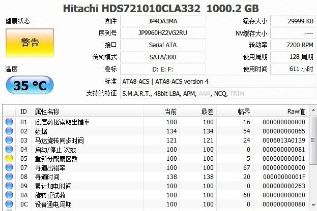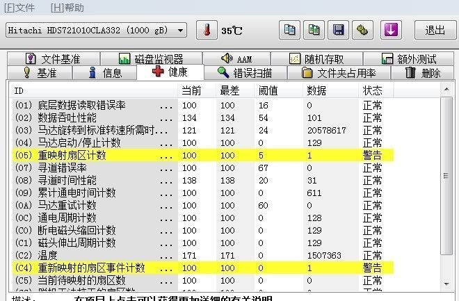 用了几个月的日立硬盘,HD TUNE和CrystalDiskInfo都提示警告,