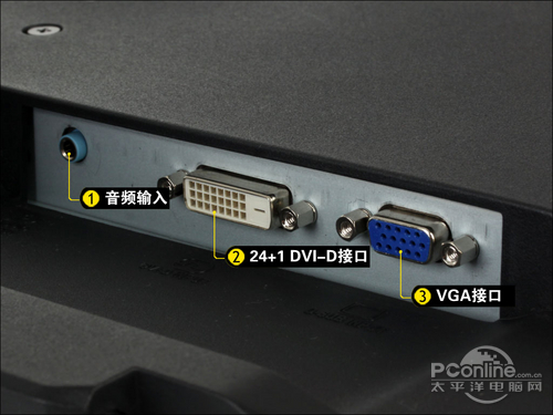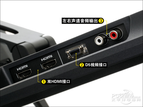 这款IPS显示器背面搭配了VGA+DVI显+音频输入接口。而侧面有双HDMI接口、D5端子接口以及音频输出接口。接口比较丰富,方便用户接入各种设备。
