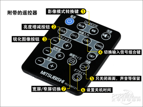 这款显示器搭配了遥控器,不过由于这款产品是用于工程样品,所以搭配的显示器是采用日文的,为了方便用户了解,我们在上图标注了大部分按钮的功能。