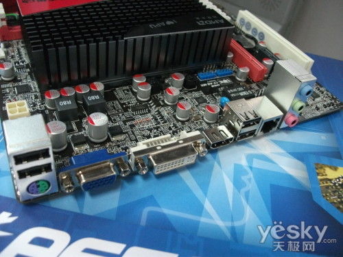 接口部分,速能AE50 V14主板提供了1个PS/2键鼠通用接口,4个USB2.0接口,1组HDMI+DVI+VGA视频接口,1个千兆网络接口以及3个3.5mm音频接口。该主板提供了全功能视频输出能力,非常适合家庭HTPC多用途视频播放。