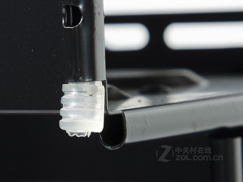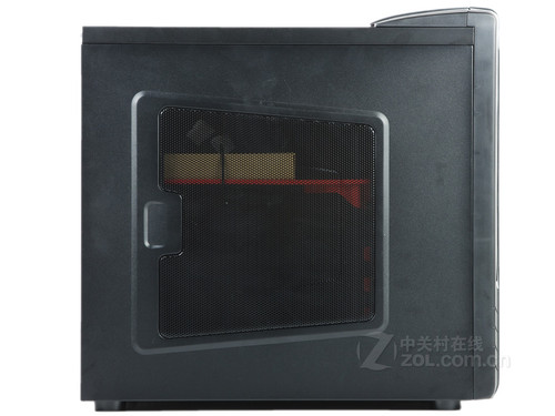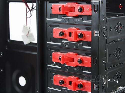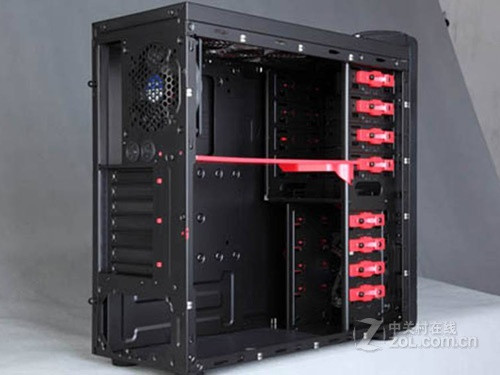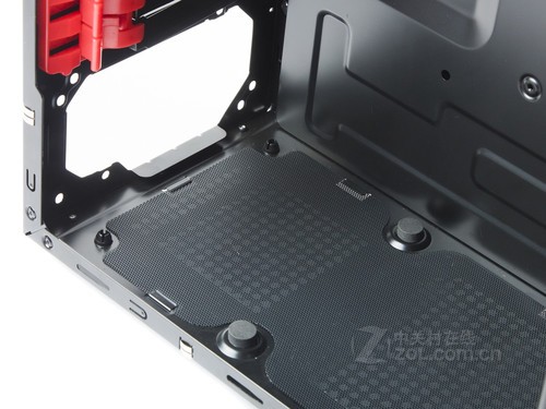 尤其我们在图中看到的机箱内部红色挡板,他到底是花瓶还是什么?事实上,隔板上下完全隔离创造了非常有利的条件,因为其硬盘位采用了通体式设计,光驱位又全部采用了冲网,也就意味着可以隔离为完全分开的上下两道。