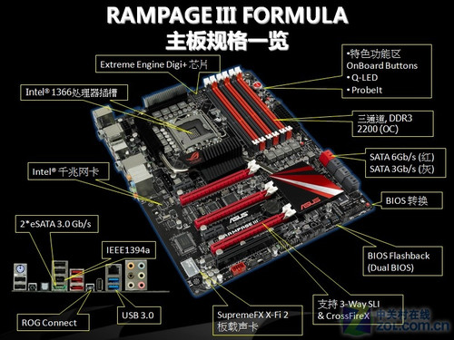 华硕Rampage III Formula主板提供USB 3.0和SATA3 接口支持,板载千兆网卡,采用的SupremeFX X - Fi第二代声卡支持EAX 5.0和THX TruStudio PRO特色,配合ROG GameFirst功能可以让用户获得更好的游戏影音体验。