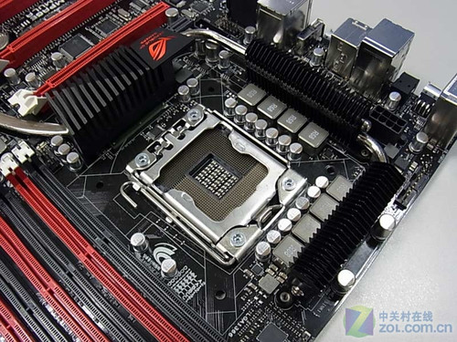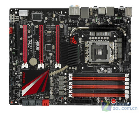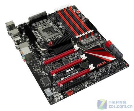 Rampage III Formula的设计风格与Rampage III Extreme非常相像,而在规格方面则比其略低。从主板上我们可以看见CPU部分采用了8相供电设计,提供了单个8pin供电接口;搭配6根共2组DDR3三通道内存插槽;拥有3根PCIe X16插槽,可支持SLI以及CrossFire技术;此外还具备2根PCIe X1插槽以及1根PCI插槽,可满足大部分用户的扩展需求。