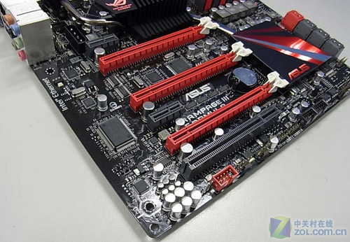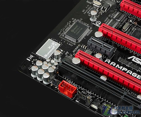 扩展方面,RampageIII Formula方面为用户提供了3条PCI-E 2.0 x16显卡插槽,可在x16,x16/x16和x16/x8/x8三种模式下运行,此外还提供了2条PCI-E x1插槽和1条PCI插槽。支持NVIDIA 3-Way SLI和ATI CrossFireX Technology。