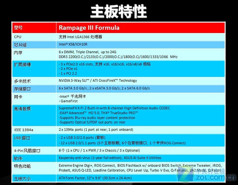 (Asus)在前段时间更新了旗下ROG系列产品线,相继推出了Rampage III Extreme以及Rampage III Gen主板,ZOL目前也获得了华硕今年第三款基于X58芯片组设计的ROG系列新作――Rampage III Formula的全部资料。最新消息得知这款主板已经开始出货市场,相信在不久之后就能够在卖场上见到。