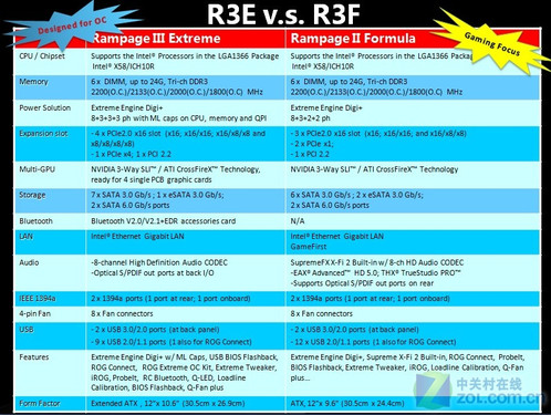 华硕这款最新玩家国度Rampage III Formula主板主要用于针对发烧级游戏玩家,R3E则主要面对发烧级的超频玩家,R3F规格上相对与R3E来说有所缩减主要归因于这两个型号面对不同的用户群体。对于广大的游戏玩家来说,R3F采用诸多的游戏技术,因此在游戏方面相对R3E更加具有优势。