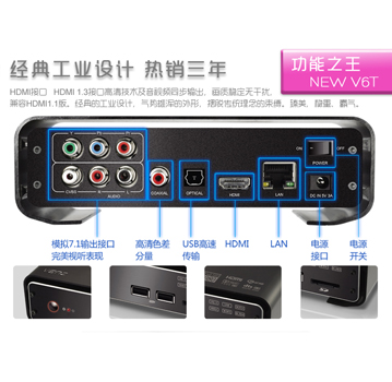 其他接口 HDMI、色差高清(YPbPr)、复合视频(CVBS)、L/R两声道输出、同轴、光纤、USB2.0Hihg Speed 高速接口(2个),网络接口,支持无线WIFI