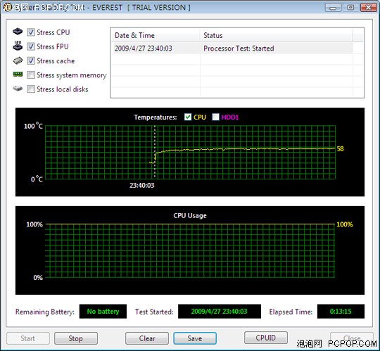 我们使用everest中的稳定性测试让[url=]CPU[/url]满载,并记录温度,风扇全速时,测试一共进行了13分钟,最高温度为59℃,平均温度为58℃。