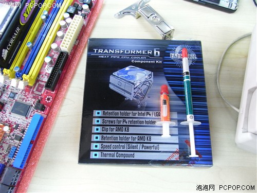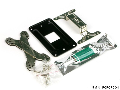 散热器附件提供了Intel LGA775和[url=]AMD[/url] K8 AM2的扣具,一管硅脂,一些螺丝螺母。