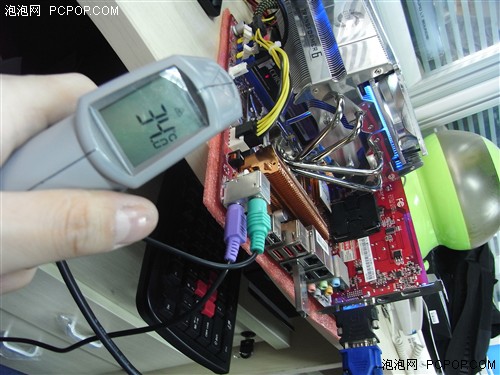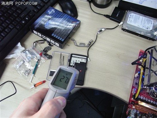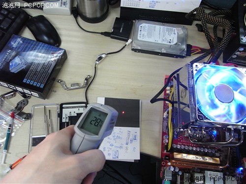 这次测试和以往一样,使用Raytek MT04红外测温仪测量[url=]主板[/url]供电部分温度和环境温度。