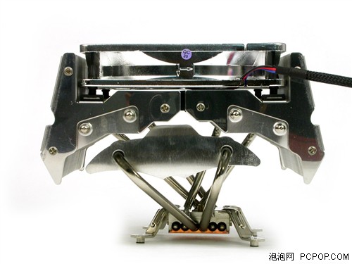 我们无法用什么造型来形容它,只能说实在很独特,散热器底盘两侧还有羽翼一样的设计,其实这样可以起到导风的作用。不过这也挡住了散热器底部很多细节。连同[url=]风扇[/url]一起,散热器都涂上的金属银色,看上去像个机器战士。