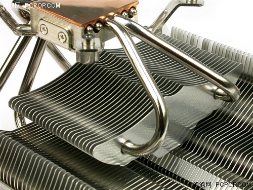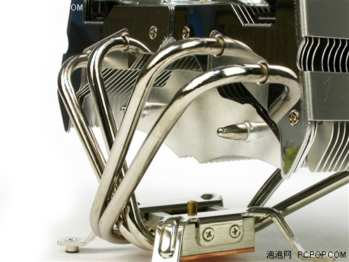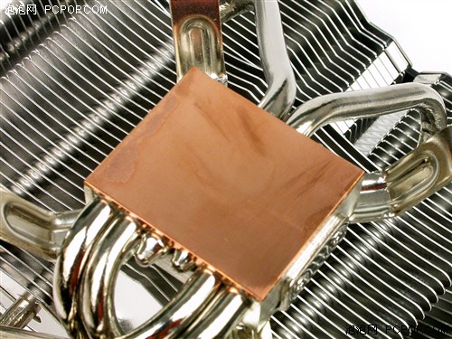 散热器一共使用了6根热管,四根支撑住上方那组大鳍片,两根支撑下方那组小鳍片,特别指出就在于四根热管交叉排列,显得有限‘暴力’。