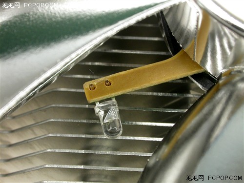 散热器从下面看好像把甲壳虫翻了个肚子向天一样,底下是它的腹隔膜,一段一段的。呵呵,不乱比喻了,这里可以看到大鳍片间的折边,可以帮助散热器固定外型。