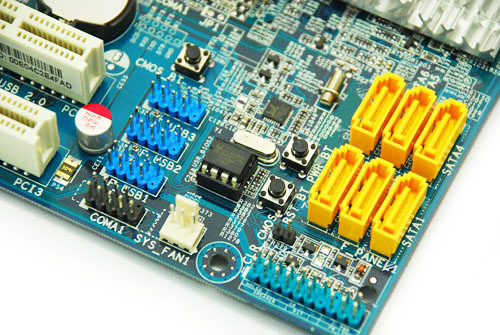 6个SATA2接口、开机重启按键和COMS恢复按钮