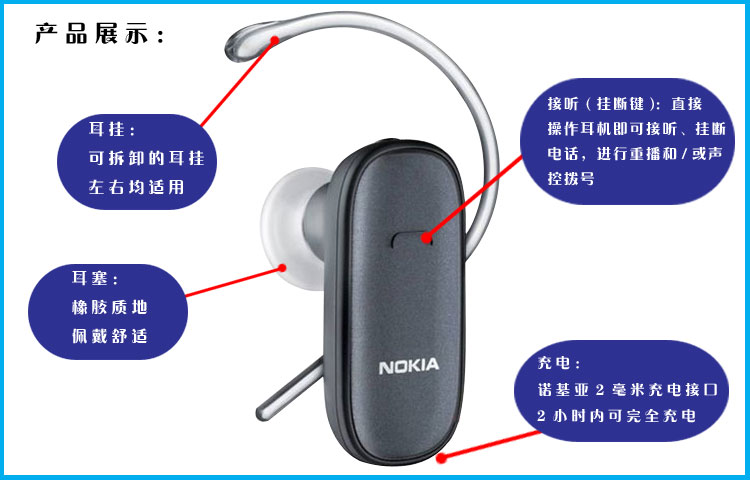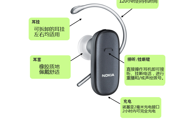 该耳机具有基本的接听、挂断键、电源开关键。可以让您持续通话长达5.5小时,待机时间120小时。随机附送可选耳挂。耳机包含微小部件,因此请您将其放在儿童接触不到的地方。