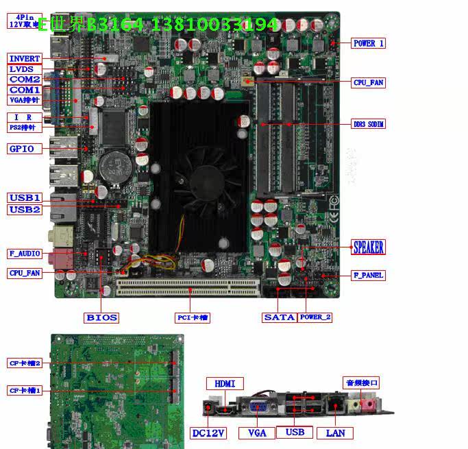 | 前置 I/O接口 | • 2 组 USB排针 支持4个USB2.0端口 • 1 个风扇连接器连接 CPU 和系统风扇 • 1组前置音效插针 • 2组串口排针 。1组LVDS排针 。1个1X12PIN VGA插针.1组7PIN PS2插针 | 后置 I/O接口 | • 4个USB2.0端口 . 1个默认VGA接口(可换为DVI接口插件) • 1个DC输入接口 • 1个HDMI接口•1个LAN端口•1个音频接口 | |