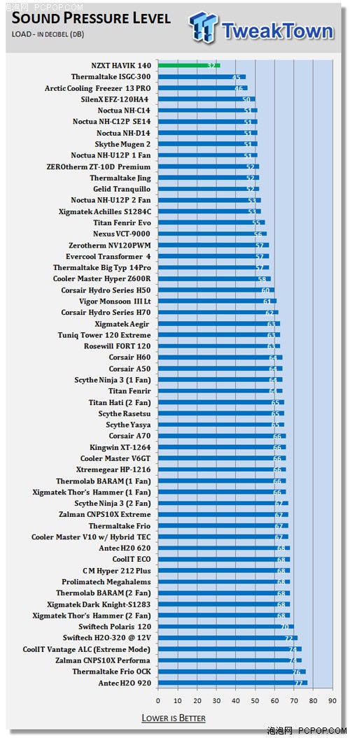 tweaktown有一套自制测试平台,可以保证稳定的环境温度,所以硬件配置并不重要,从众多散热器的对比中就能够看出HAVIK 140所应表现的水准。