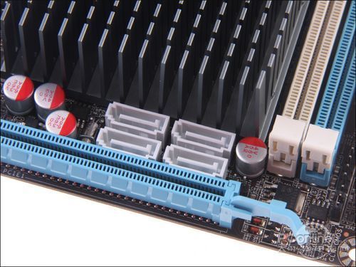 在PCI-E插槽上方,主板设计了4个排布规整的SATA3.0插口,口位向上,方便用户直插。