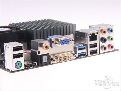 主板背部输出接口方面,该主板提供了6个USB接口,其中4个是USB2.0,2个是USB3.0,1个PS/2鼠键兼用接口;视频输出方面,提供了HDMI/DVI-D/VGA全视频输出接口,音频方面,提供支持8声道音频输出接口,同时该主板还提供了1个光纤/同轴端口和一个千兆网络接口。总而言之,“麻雀虽小,五脏俱全”这句话在这里形容这块玲珑小板是最合适不过了。