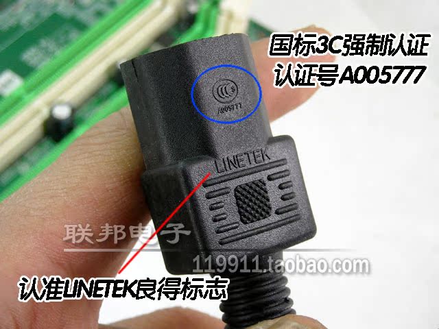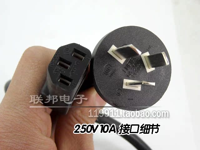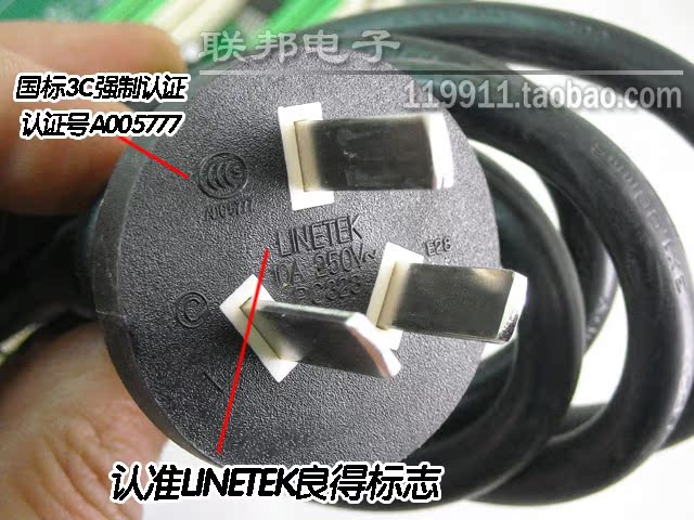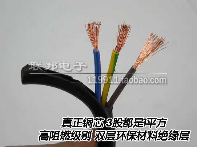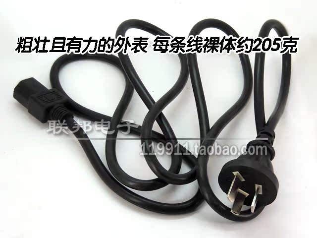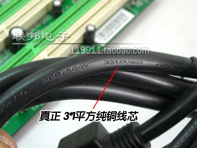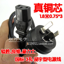 国标三插-通用品字三孔,长1.8米,超粗外径约7.5mm,真正足3x1.0mm2纯铜内芯,可以通过的峰值负载可达到几千瓦。通过中国CCC safety认证,3C认证号A005777。线材足标足料,线芯材质和插销都是纯铜,每条重约0.2公斤!