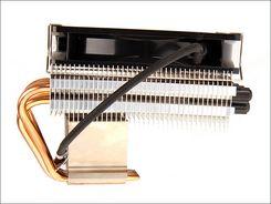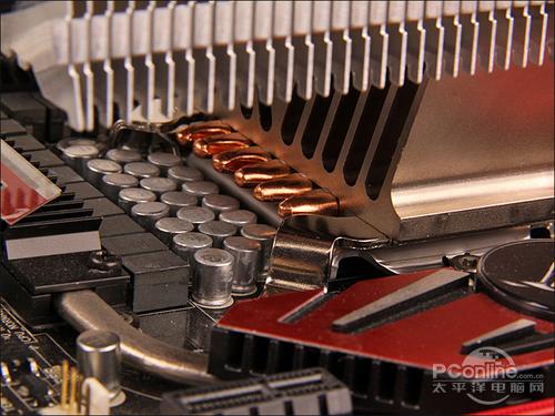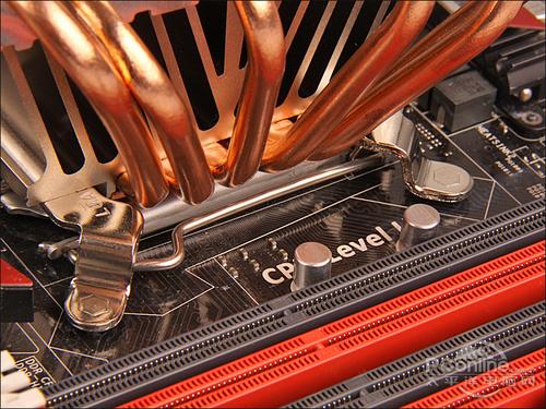 安装完毕后,由于纯铜散热面兼顾了所有平台CPU扣具的面积,所以安装在LGA 1156的底座时很好地得到全面接触。5条热导管能够直接接触CPU核心,且面积较大的鳍片与散热风扇可以直接进行主板CPU供电电容的散热,有利于整体环境温度的降低。