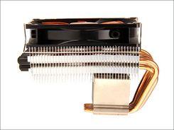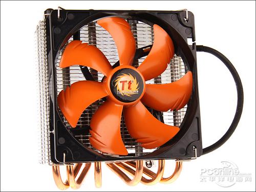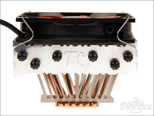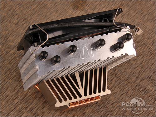 散热器的风扇部分特意进行了倾角处理,这样做有利于将散热风扇的风流集中在散热底座中。
