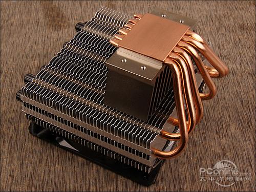 该散热器采用了6根纯铜散热管,热管在散热鳍片中呈波浪状一字排开,可以保证散热鳍片的热量分布均匀,同时顶部的热管封闭也采用了保护套遮罩,避免了裸机运行时手部接触散热管时被烫伤的意外。