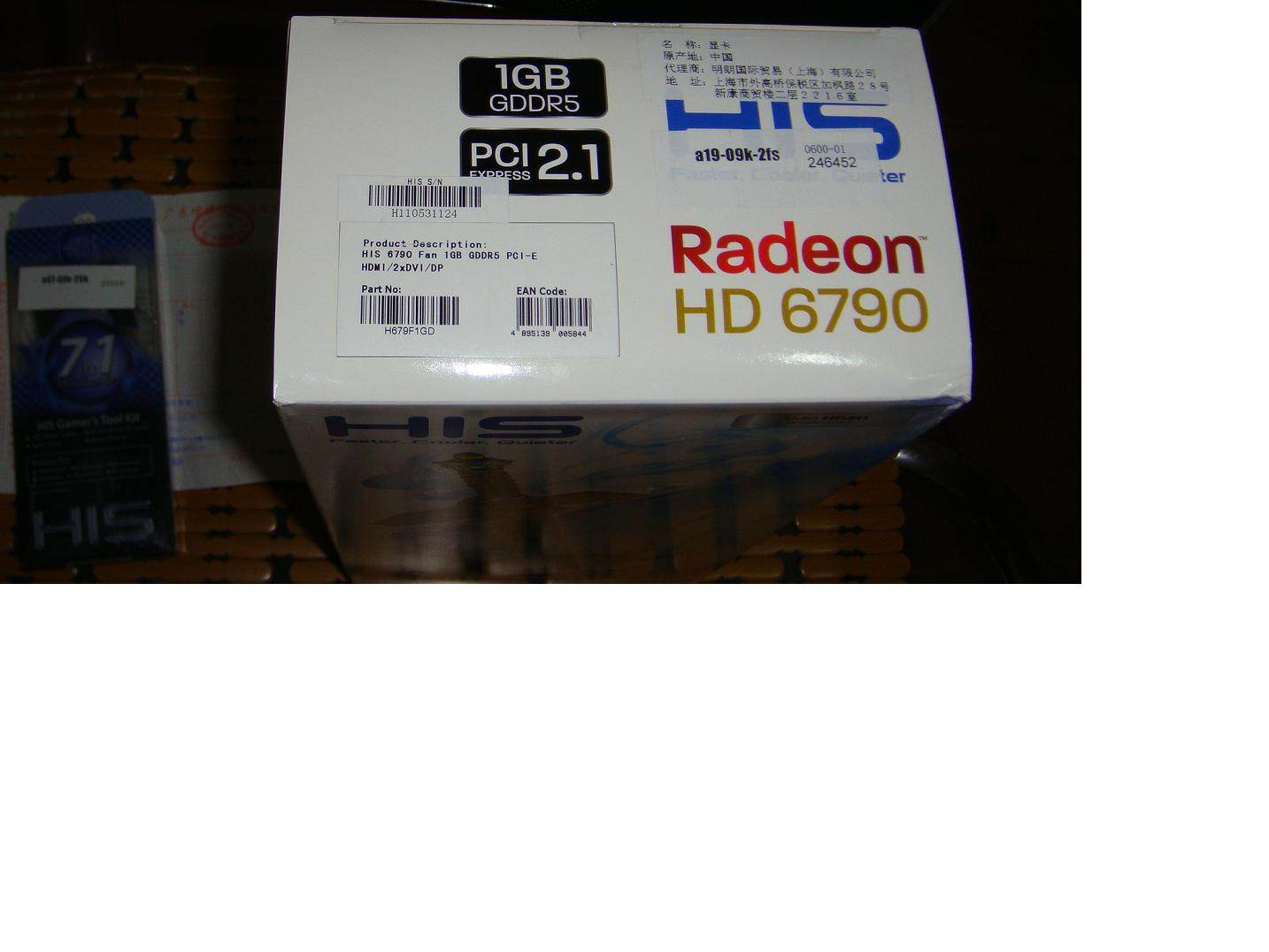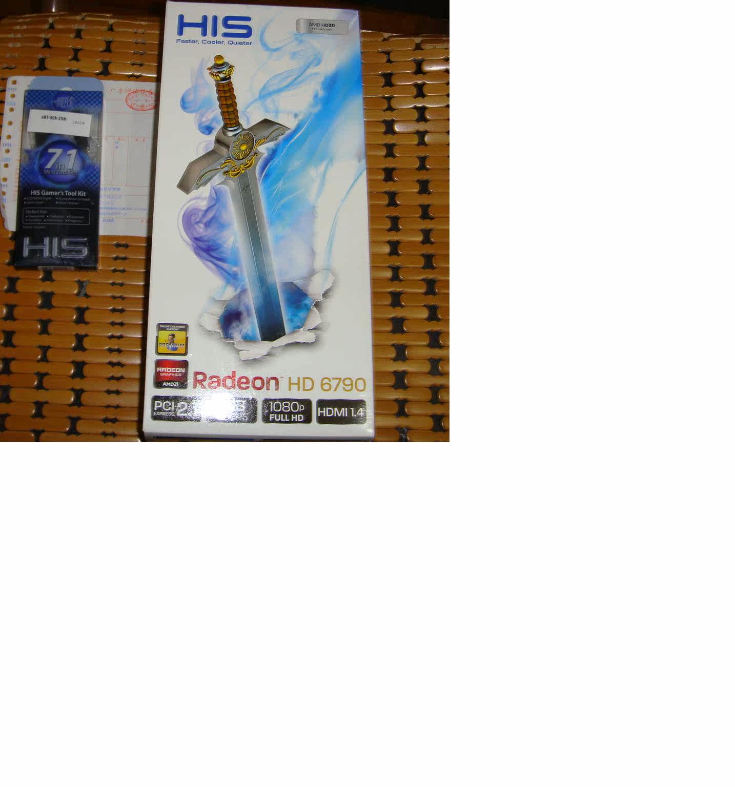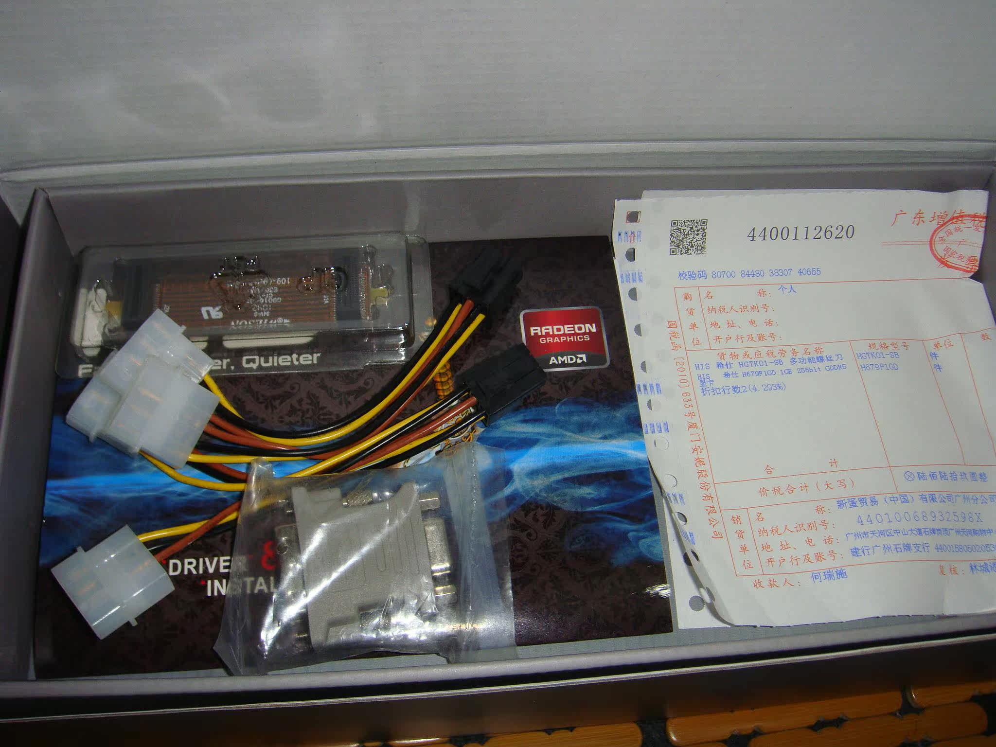 2011.12.28购于新蛋,显卡昨天收到,实际使用时间不到一天,基本全新,附赠的赠品多功能螺丝刀自用了,其余包装和附件齐全,1*DVI转VGA转接口,2*6pin转大4pin转接线,1*CF交火桥,1*说明书/驱动盘,带新蛋发票