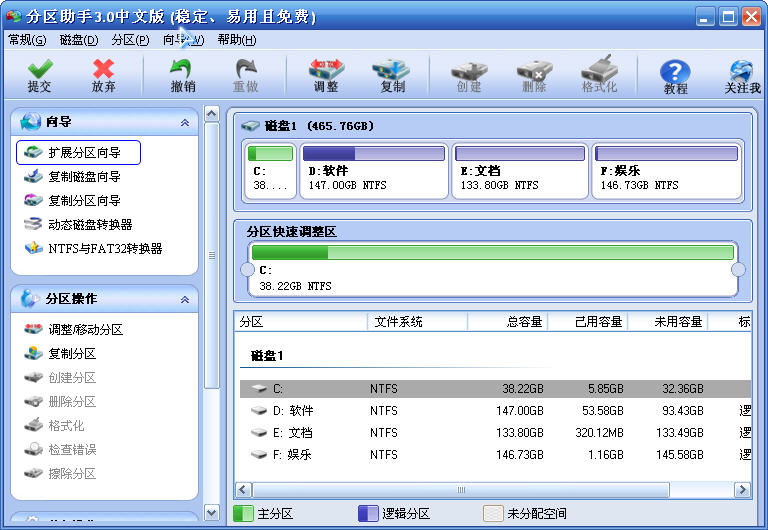 2.使用分区助手的“扩展分区向导”来扩大C盘,能让我们能快速的完成C盘的扩大。扩展分区向导在扩大C盘前不需要进行其它的操作,只需要点击软件界面左上角的“扩展分区向导”,然后在引导操作的过程中根据提示选择自己想要的选项就能完成C盘的扩大。使用分区助手的扩展分区向导时需要注意硬盘分区格式必须为NTFS,如果不是此格式可以通过分区助手的“NTFS与FAT32转换器”转换磁盘格式为NTFS再进行操作。
