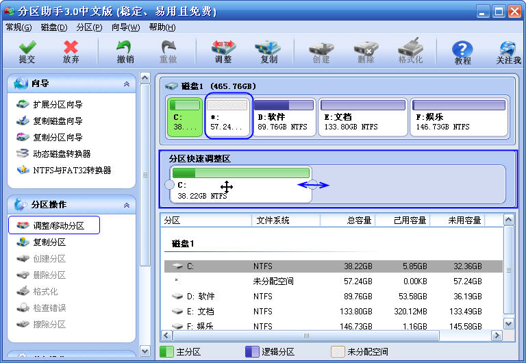 1.使用分区助手的“调整/移动分区”改变C盘分区的大小。我们可以通过缩小相邻分区来扩大C盘或者通过压缩C盘的空间来缩小C盘。这样的缩小C盘很方便,直接缩小C盘后把多出来的未分配空间用来创建新分区或者扩大相邻的D盘;扩大C盘会有一定的局限性,在扩大C盘时需要有与其邻近的未被分配的空间,然后才能完成扩大的操作。