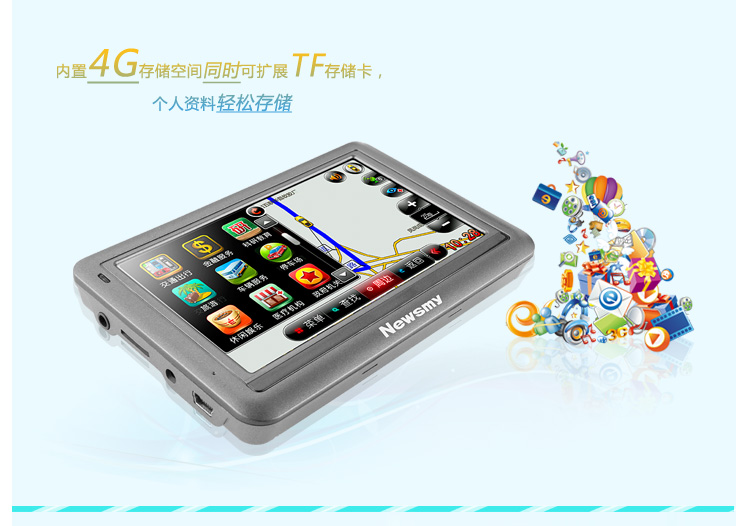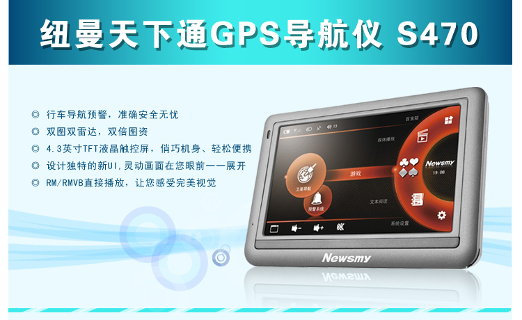 | 【产品特点】 智能输入:强大的手写输入功能,可直接在屏幕上书写目的地名称,识别率高。 FM发射: 支持FM发射功能,可将机内的音频文件发射到汽车通过汽车音响系统收听。 触控屏幕:4.3英寸TFT高清液晶触摸显示屏,支持16:9宽屏显示,图像清晰,播放影片流畅,精彩画面尽收眼底。 操作自如:触控面板,配合手写笔操作便捷。 电影欣赏:超酷迷你掌上影院,可播放RM/RMVB、JPG、AVI、WMV、ASF、MPEG、MPG、MOV等多种视频格式直接播放,无须转换,最新热门电影轻松下载。 音乐欣赏:MP3、WMA等音乐播放。 图片欣赏:支持GIF、BMP、PNG格式图像浏览,精美图库随身携带。 随身书库:TXT文本阅读,随时下载阅读最新的资讯。 TTS 语音:人性化TTS语音播报功能,清晰播报功能名称,并可阅读电子书、唐诗宋词。 电子词典:内置英汉、汉英电子词典,丰富的词汇,并支持输入联想词语,学习外语更加轻松。 娱乐游戏:多款经典游戏功能,出行娱乐两不误。 唐诗宋词:本机内置大量唐诗宋词,随时随地细品古典文化充实您的闲暇时光。 科学计算:内置计算器,做您贴心的商务助手。 固件升级:本产品将继续开发提供新的功能,相关信息可以关注网上发布。 内置锂电:内置大容量锂离子电池,支持长时导航。 |