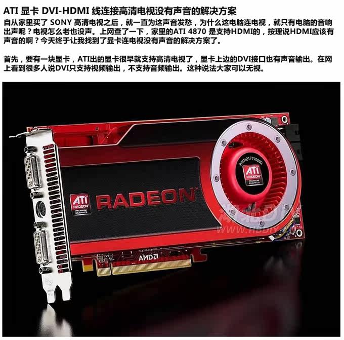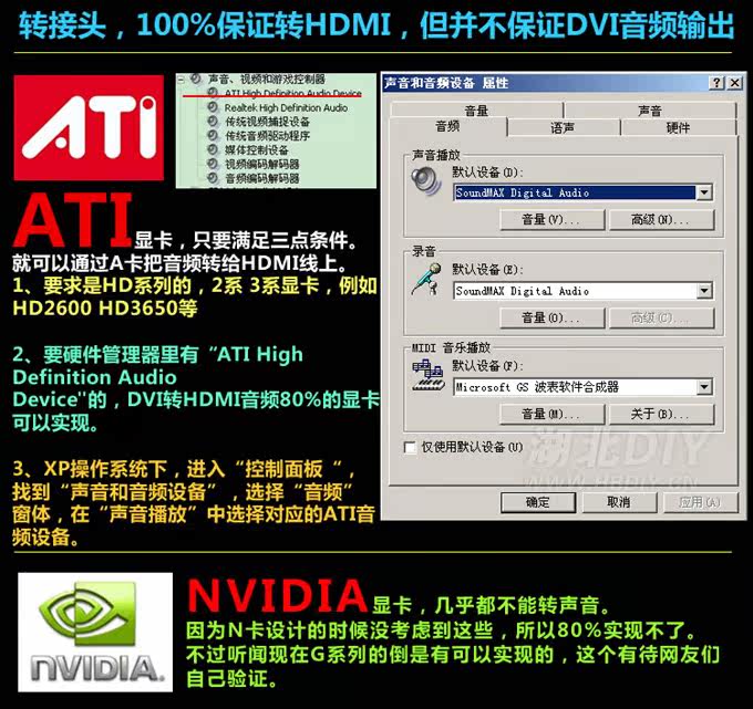 如果你的显卡是AMD/ATI 2XXX 系列,比如2400/2600之类的,还能直接输出声音哦!