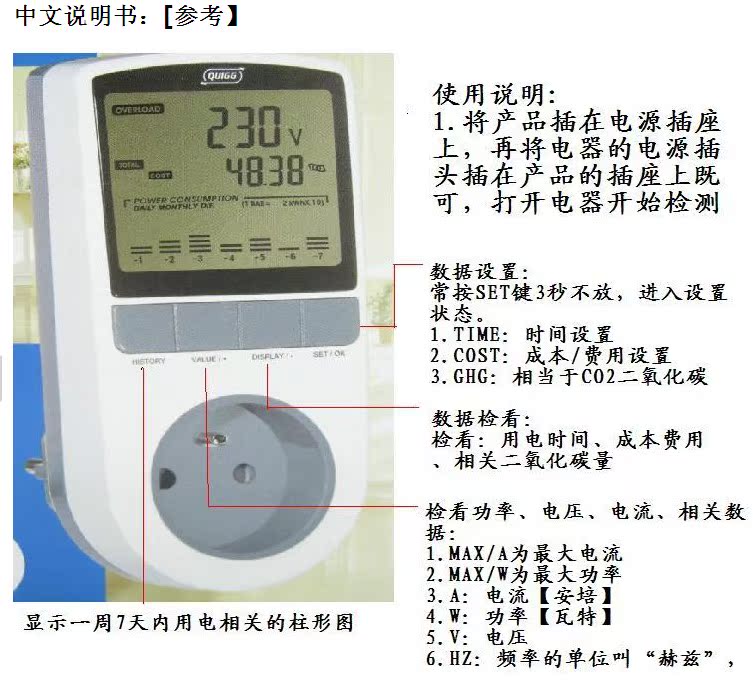 收起 [全国] [售] 个人收藏德国QUIGG品牌功率测试仪 支持最大3680W商品类型:二手商品 运费:无运费 剩余时间:24 天 5 小时 商品数量:1地点:山东累计售出:0现价:60.00 元注意: 1产品插口为德国接口,送转头,注意使用。 2.输入电压;220v 50HZ 16A 3.最大输出功率:3680W 16A 国外原说明,看的懂的朋友可了解一下 国外网止:[url=]http://www.teknihall.be/index.php?id=1129[/url] Features - LCD display - indication of measured values, time, cost and greenhouse gas emission - power history over max. 7 months - children's safety protection - units in Watts, Volts, Ampère, Hz, power factor - max. current : 16A - voltage between 190 and 270V - frequency between 46 and 65 Hz - power consumption from 0 to 999,999kWh - greenhouse gas emission from 0 to 999,999kg - power from 1W to 3680W (0,001W resolution) 以下是插上转换头的图片: ![]() ![]() ![]() ![]() ![]() ![]() ![]() ![]() ![]() ![]() ![]() ![]() | |
